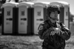 Autorze, popraw mnie jeśli się mylę, chciałeś w prosty sposób pokazać człowieka w zwyczajnej chwili? Tę prozaiczność, która miała przysłużyć się opowieści, postanowiłeś podkreślić wypełnieniem całego tła kibelkami? Jeśli tak, to niestety powstało zdjęcie o kibelkach, które częściowo zasłonił przypadkowo znajdujący się tam żołnierz.